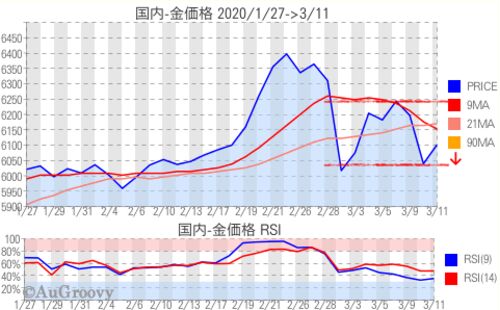 2020年3月11日の国内、金価格は前日比+63円、プラチナ価格は前日比+39円となりました。 国内金価格推移 2020年3月11日 過去31日の高値:6,397(2/25) 安値:5,959(2/5) 変動値幅:438 変動率:7.2% 本日の国内金価格(買取): ■PRICE(価格):6,102円/g(前日比+…