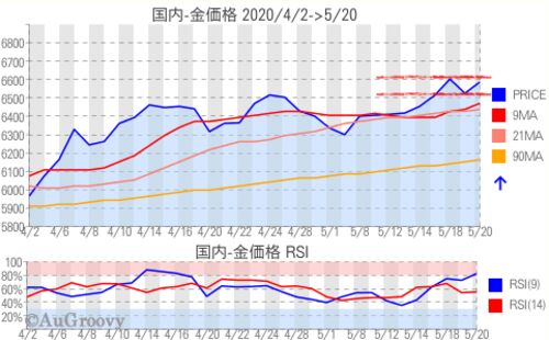 2020年5月20日の国内、金価格は前日比+62円、プラチナ価格は前日比+74円となりました。 国内金価格推移 2020年5月20日 過去31日の高値:6,603(5/18) 安値:5,965(4/2) 変動値幅:638 変動率:9.7% 本日の国内金価格(買取): ■PRICE(価格):6,587円/g(前日比+…