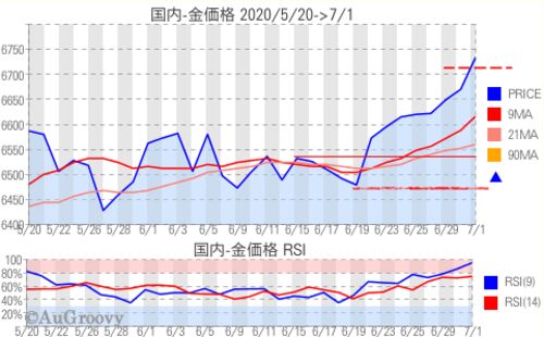 2020年7月1日の国内、金価格は前日比+64円、プラチナ価格は前日比+38円となりました。国内金価格は過去最高値を更新しました。 国内金価格推移 2020年7月1日 過去31日の高値:6,734(7/1) 安値:6,428(5/27) 変動値幅:306 変動率:4.5% 本日の国内金価格(買取…