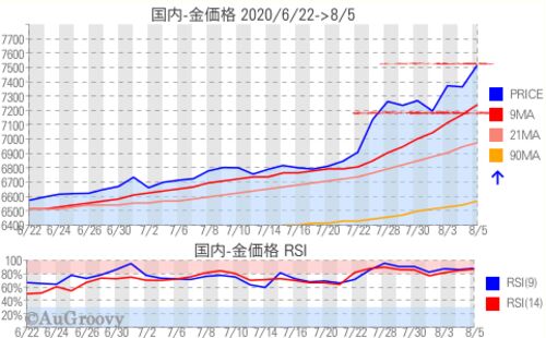 2020年8月5日の国内、金価格は前日比+152円、プラチナ価格は前日比+26円となりました。国内金価格は過去最高値を更新しました。 国内金価格推移 2020年8月5日 過去31日の高値:7,516(8/5) 安値:6,573(6/22) 変動値幅:943 変動率:12.5% 本日の国内金価格(買…