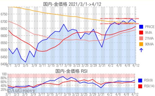 2021年4月12日の国内、金価格は前日比-23円、プラチナ価格は前日比-91円となりました。 国内金価格推移 2021年4月12日 過去31日の高値:6,716(4/9) 安値:6,413(3/5) 変動値幅:303 変動率:4.5% 本日の国内金価格(買取): ■PRICE(価格):6,693円/g(前日比-2…