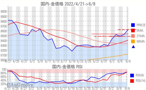 2022年6月8日の国内、金価格は前日比+99円、プラチナ価格は前日比-24円となりました。 国内金価格推移 2022年6月8日 過去31日の高値:8,817(4/21) 安値:8,181(5/19) 変動値幅:636 変動率:7.4%本日の国内金価格(買取):■PRICE(価格):8,622円/g(前日比+99…