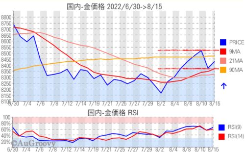 2022年8月15日の国内、金価格は前日比+57円、プラチナ価格は前日比+35円となりました。 国内金価格推移 2022年8月15日 過去31日の高値:8,740(6/30) 安値:8,168(8/2) 変動値幅:572 変動率:6.8%本日の国内金価格(買取):■PRICE(価格):8,432円/g(前日比+57…