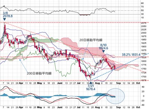 インフレに鈍化の兆しが見られ、7月後半からは反発の流れとなったNY金は8月前半、3月高値から7月安値までの38.2%戻し(1831.4)付近で頭打ち、楽観見通しの軌道修正を図るFRB関係者のタカ派発言などを受けて反落の流れも、やや一方的となり過ぎた8月第4週に…