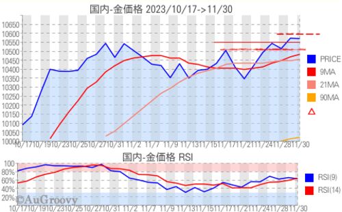 2023年11月29日の国内、金価格は前日比+58円、プラチナ価格は前日比+52円となりました。国内金価格は年初来高値を更新しました。 国内金価格推移 2023年11月29日 過去31日の高値:10,573(11/29) 安値:10,090(10/17) 変動値幅:483 変動率:4.6%本日の国内金…